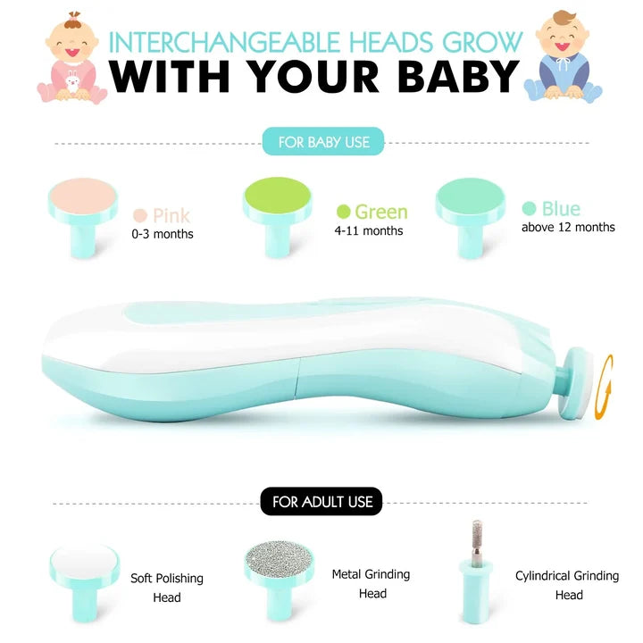 Versatile tools: the baby nail file comes with 3 cushioned safe grinding heads for babies and children, as well as 3 attachments for adult use.